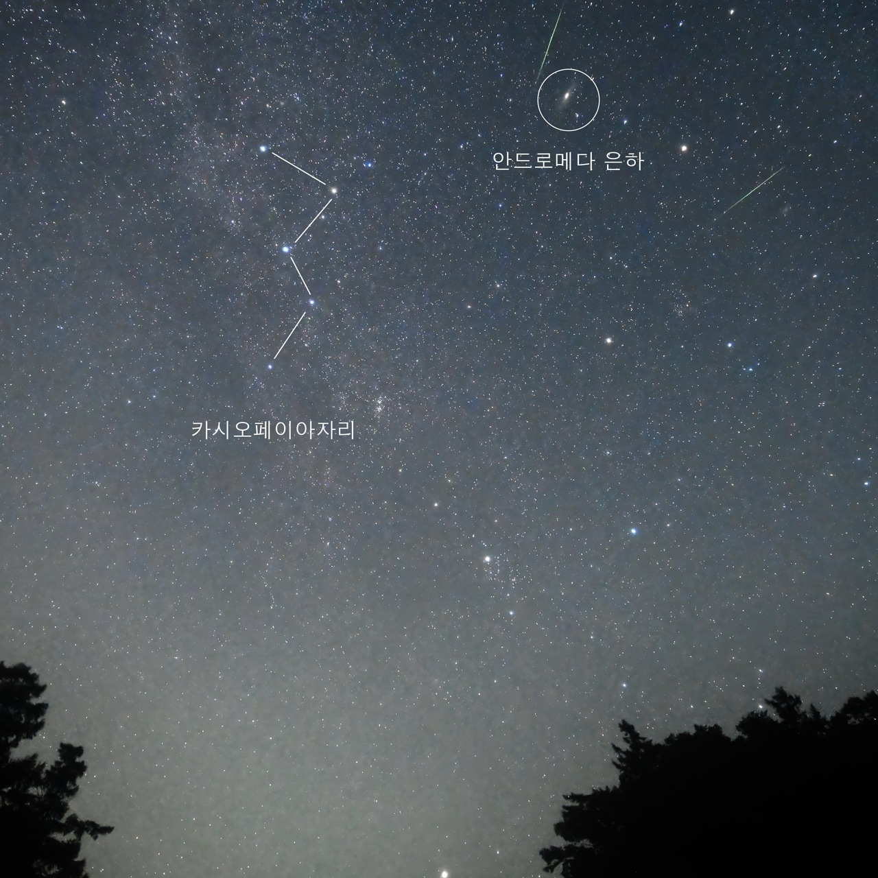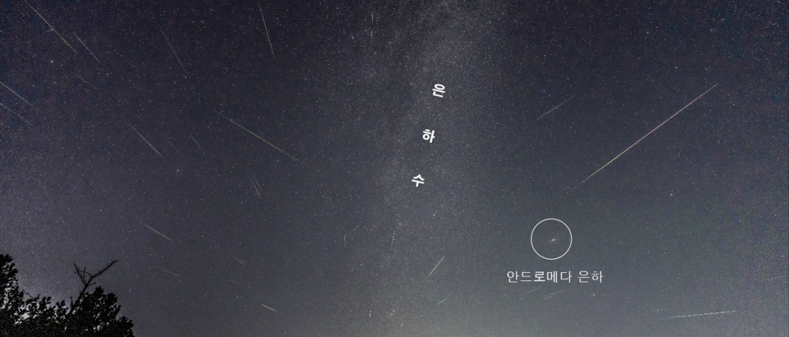 사진5. 카시오페이아자리와 안드로메다은하 그리고 2024 페르세우스자리 쌍유성우(사진: 일산어린이천문대 은하수선생님)