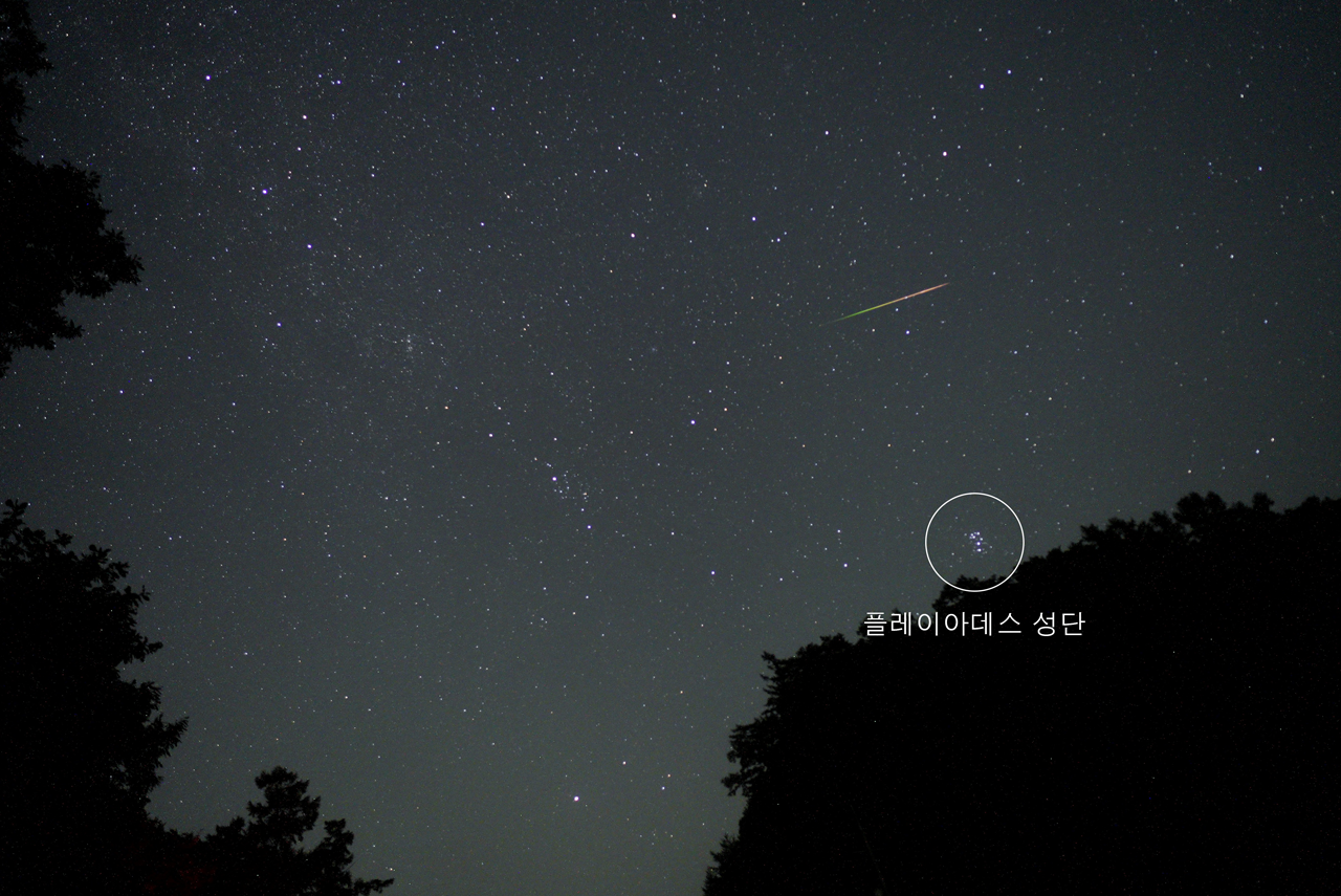 사진4. 플레이아데스성단과 2024 페르세우스자리 유성우(사진: 홍천관측소 별똥선생님)